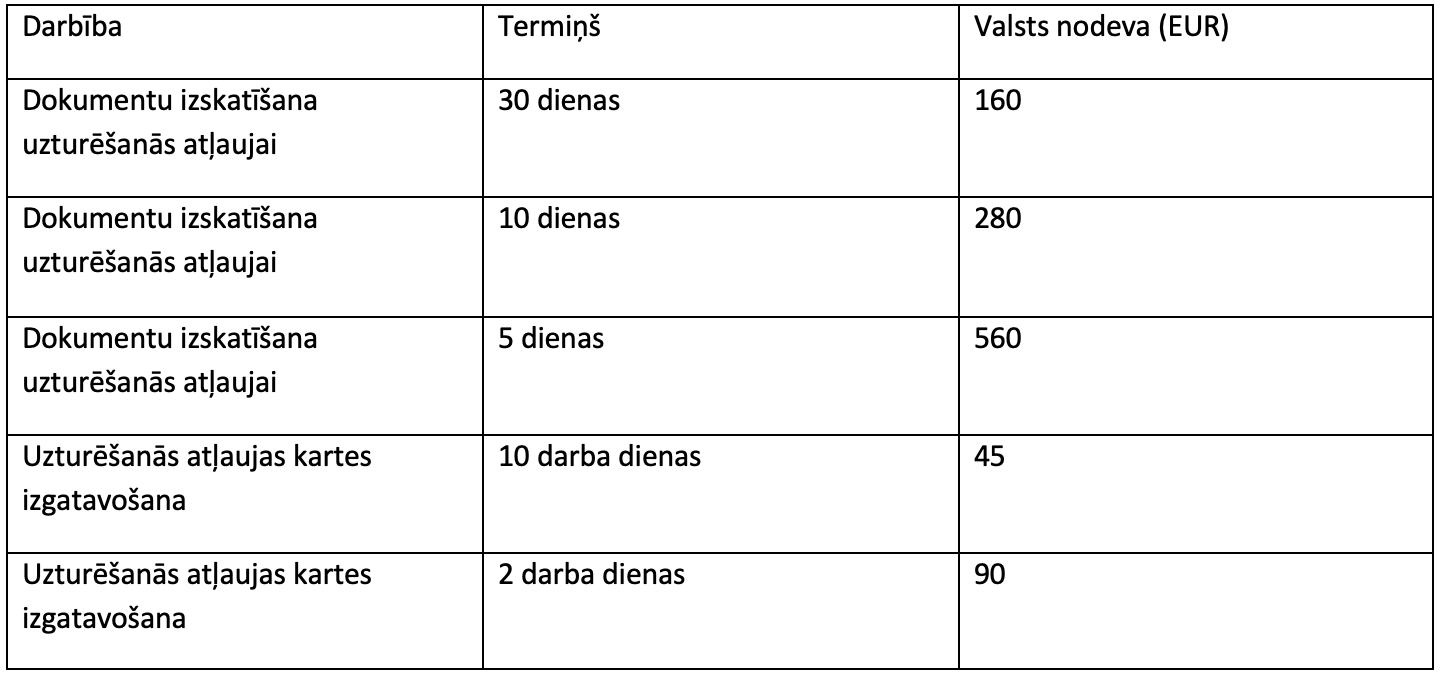 Izvēlies standarta vai paātrināto izskatīšanu (30/10/5 dienas) un samaksā atbilstošo nodevu. - Pēc pozitīva lēmuma: vīza (ja esi ārvalstīs) un kartes saņemšana