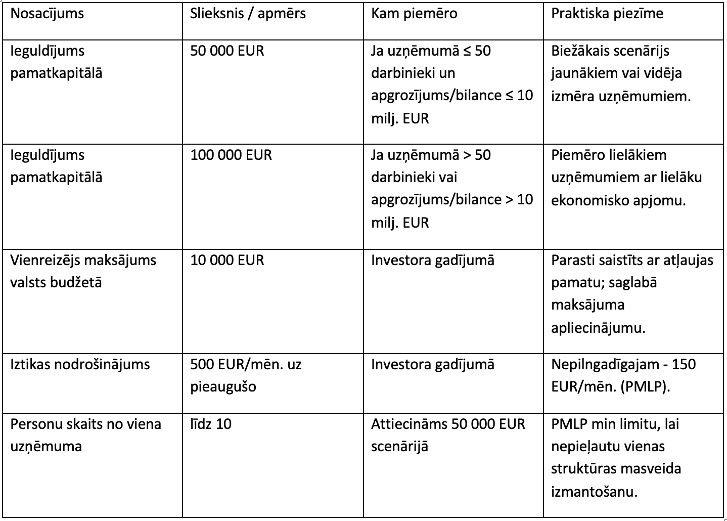 PMLP norāda divus ieguldījuma sliekšņus, kas atkarīgi no uzņēmuma darbinieku skaita un apgrozījuma/bilances. Papildus paredzēts vienreizējs maksājums valsts budžetā un minimālais iztikas nodrošinājums.